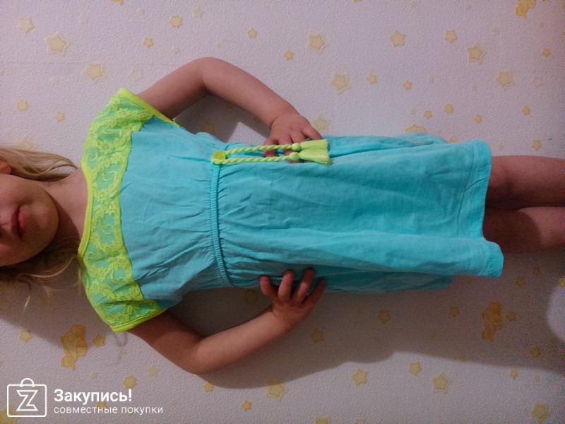 получены платья: Платье Dalmaz (размер 5-6 лет) и платье голубой (размер 6 лет). трикотаж неплохой (пока не стирала, т.к. на вырост), швы обрабоианы, но... так себе. на фото видно. на фото ребенок 4,5 года, рост 107 см. платье в цветочек - лежит до осени, а голубое платье маломерит (для сравнения см. фото) за \\\"размерность\\\" сняла звезду. закупка непростая, организатор справляется. спасибо, ждем остальные заказы