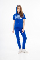 Яркий модный костюм с контрастными вставками и лампасами. Кофта свободного кроя с капюшоном и коротким рукавом.,