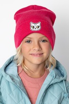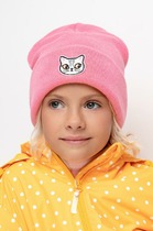 Двойная розовая шапка из полушерсти. Украшена нашивкой с изображением котика.