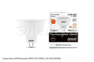 Лампа Gauss LED Elementary MR16 3.5W 3000K 1/10/100 (13514)