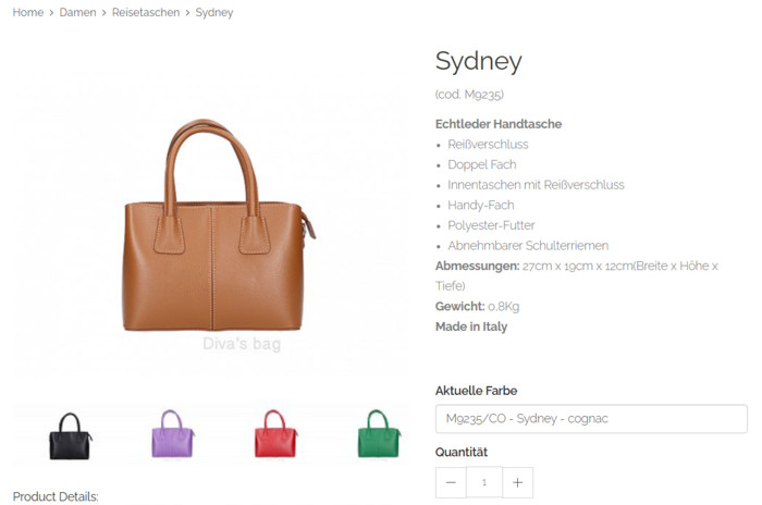 Цвет выбирается в поле Aktuelle Farbe, чуть ниже описания самой сумки - на каждый цвет еще и свой артикул.