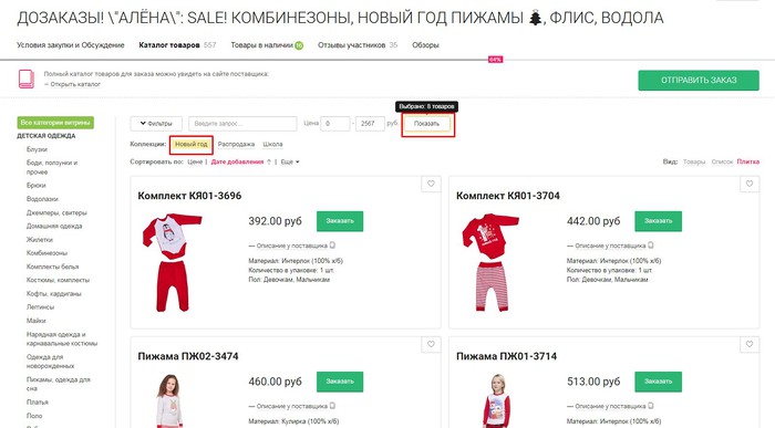 Чтобы легко найти на витрине товары из коллекции "Новый год", открыв тему на первой странице, нужно нажать "Открыть все товары на витрине", затем под надписью "Фильтры" в разделе "Коллекции" нажать "Новый год", и в строке выше справа нажать кнопку "Показать". На скрине ниже нужные кнопки выделила красным.