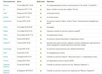 | Пользователь | Дата | Действие | Причина |