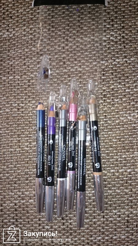 Заказывала: 1 Карандаш для глаз 2в1 Chanel Crayon Eyeliner (цв.). Упаковка повреждена, 2 карандаша сломаны, цвета - синий, фиолетовый, розовый и 3 оттенка серого. наносятся хорошо, но не стойкие, через 4 часа расплываются.