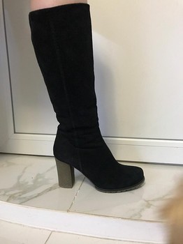 Материал: натуральная замша Подклад: натуральный мех, полный (до верха). Высота каблука 8 см, высота голенища от каблука до верха 42 см. Не носила, на одном сапоге бракованная молния, требует замены . Из-за необходимости менять молнию отдам за 1800 руб, абсолютно новые и натуральные во всех местах. По маркировке 39, по факту стелька 25 см это 38 размер.
