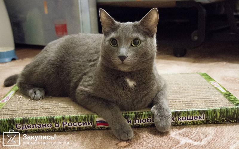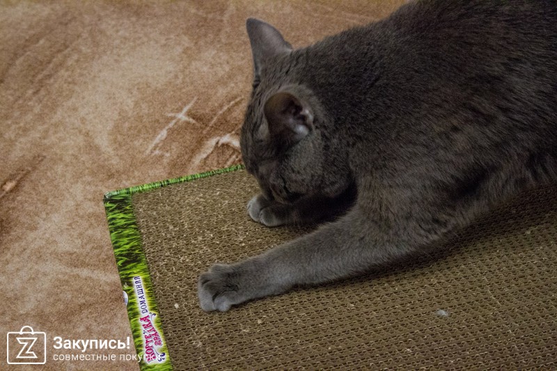 Место, где лежал пакетик с травой, все излизал, но вот насыпанное в ячейки он не сильно чует. Обиделся на нас, что пакетик забрали. И ещё большой плюс, что ее можно брать с собой. Наша сезалевская прикручена к стене, не всегда удобно откручивать, чтобы взять с собой.