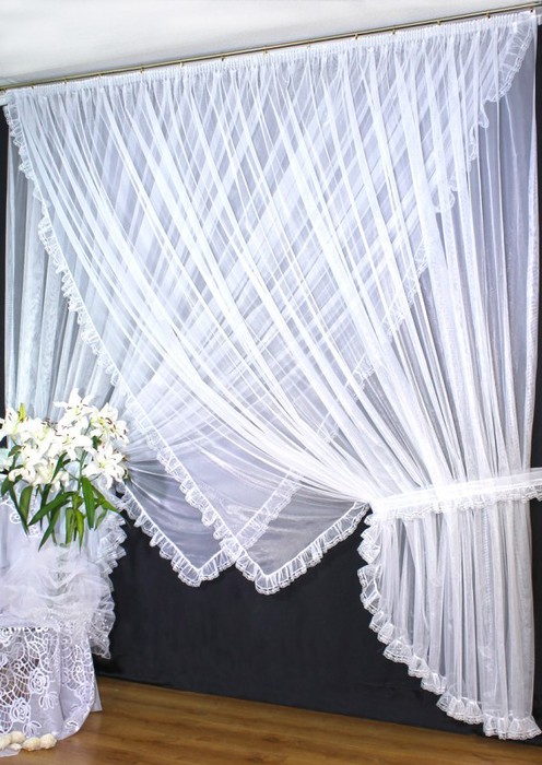 Декоративный воздушный комплект из маркизета. Состоит из двух полотен, сшитых вместе на одну универсальную шторную присбаривающую ленту. Шторки украшены игривой рюшкой, обшитой кружевом. Вы свбодно сможете перехватить пышную волну тюля ажурными прихватами или же распустить летящую ткань, чтобы она свободно струилась от карниза. По Вашему желанию, этот комплект можно использовать как самостоятельный элемент декора или сочетать с портьерами. Комплектзрительно расширяет пространство комнаты. Подхватки входят в комплектность. Размер (без сборки) : 500 см ширина - 270 см высота. Вес 1,100 кг, размер в упаковке (34 х 50 * 15 см). 100% полиэстер. Производство - фабрика WISAN (Польша).