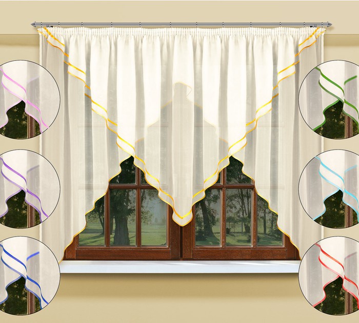 Занавеска из мягкой вуали средней прозрачности. состоит из 2-х частей, пришитых на одну шторную ленту. Украшена атласной бейкой. Возможны различные цветовые варианты декоративной бейки. Максимальная высота средней части - 150 см. 100% полиэстер. Светонепроницаемость -10-12%. Производство FIRANKA.