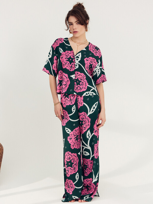 Комплект женский состоит из жакета и брюк. Жакет свободного силуэта. Рукав втачной короткий, рукав обработан вподгибку. Срезы борта обработаны подбортом из основного полотна. Жакет с центральной застежкой с петлями и пуговицами. По боковым швам разрезы. Низ застрочен швом в подгибку. Брюки свободного силуэта. Пояс цельнокроеный, с резиной внутри. По боковым швам разрезы. Низ брюк обработан вподгибку.