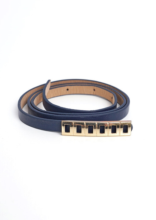 Узкий ремень из лакированной кожи с металлическими деталями. Застёжка на пряжку.