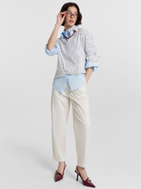 Брюки с посадкой на талии свободного силуэта. Пояс цельнокроеный с резиной внутри 40RV подвернутый внутрь. Низ изделия обработан швом в подгибку.