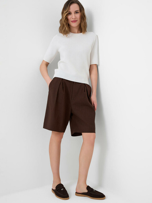 Классические женские льняные шорты. Модель средней длины, чуть выше колена. Комфортная посадка и прямой силуэт, который немного расширяется к низу. Шорты застёгиваются на молнию и пуговицу, и имеют боковые карманы. Пояс дополнен шлёвками для ремня.