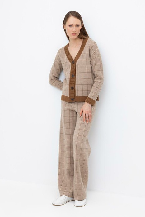 Удобные вязаные брюки прямого силуэта. Связаны жаккардом из мягкой полушерстяной пряжи. В составе 50% шерсти и 50% акрила. Шерсть мериноса в составе сохраняет тепло, а благодаря волокнам акрила изделие мягкое и дольше сохраняет форму. Плотная фактура вязания согревает и сохраняет форму во время носки.