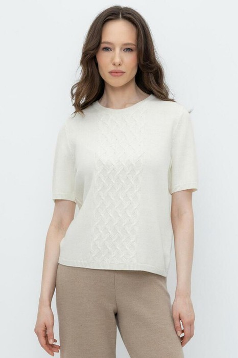 Джемпер с красивым вывязанным узором в стиле прямой футболки с короткими рукавами из мягкой полушерстяной пряжи. Прямой силуэт, стандартная длина. Шерсть в составе сохраняет тепло, а благодаря волокнам акрила изделие мягкое и дольше сохраняет форму.