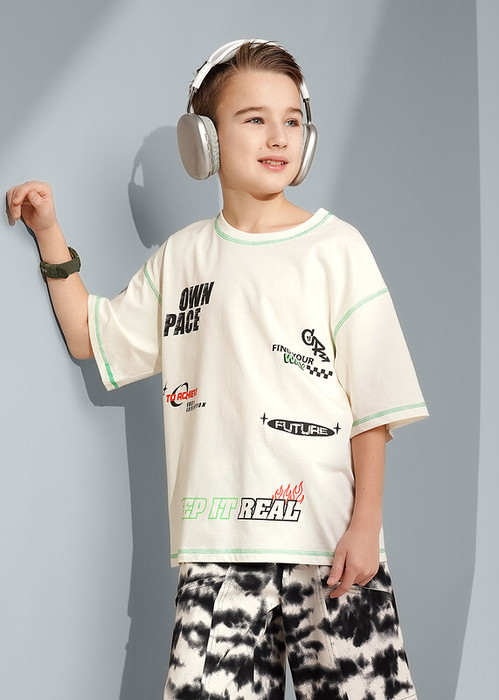 Молочная футболка из 100 % хлопка с оверсайз-посадкой, эластичной горловиной, стильным принтом и зелёным застилом нитками — комфортный и яркий вариант для подростка. Создавай яркие образы, сочетая футболку с шортами из новой коллекции!