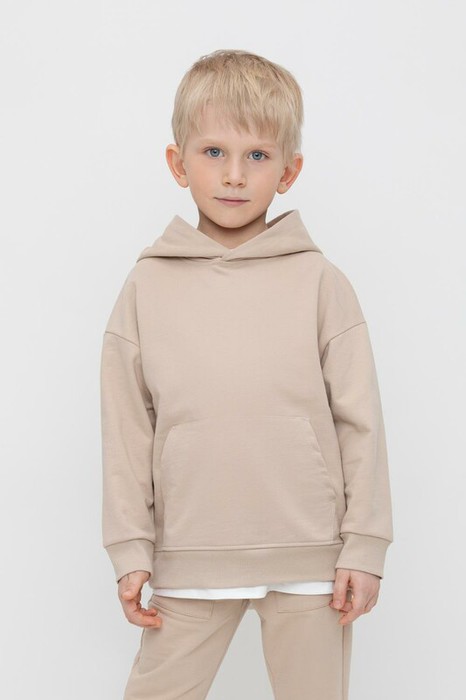 Толстовка с капюшоном для мальчика из футера трехнитки. Манжеты и пояс выполнены из эластичного полотна. Спереди удобный карман-кенгуру.