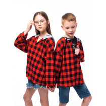 Свободная трикотажная рубашка для мальчика из мягкого петельчатого футера. В составе 80% натурального хлопка и 20% полиэстера, при этом полиэстер ввязан внутрь по особой технологии и не соприкасается с кожей. Застёгивается на кнопки. Модель с капюшоном и спущенным плечом. Рисунок в клетку выполнен из стойких текстильных гипоаллергенных красителей. Изделие сохраняет цвет и форму после многократных стирок. Все трикотажные полотна производятся в соответствии с нормами швейцарского сертификата ЭкоТекс.