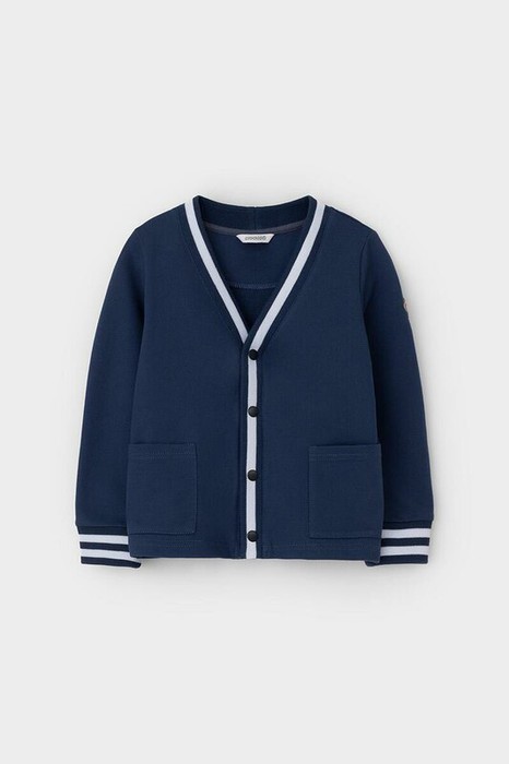 Жакет для мальчика из высококачественного трикотажного полотна футер петля. Застёгивается на кнопки. На рукавах эластичные вязаные манжеты. По бокам накладные карманы.