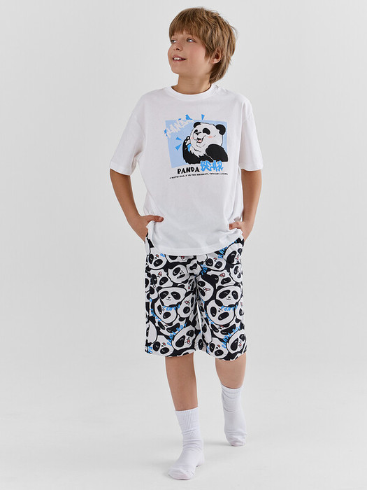 Этот домашний комплект для мальчиков — удобный и практичный выбор для отдыха и сна.  Футболка свободного силуэта обеспечивает комфортную посадку. Круглая горловина с обтачкой из рибаны добавляет мягкости и эластичности, обеспечивая удобство при носке. Свободные рукава и слегка спущенная линия плеча создают расслабленный силуэт, а обработка низа рукавов и футболки швом в подгибку делает изделие аккуратным и долговечным. Шорты ниже колена свободного силуэта и с высокой посадкой на талии обеспечивают максимальное удобство, создавая ощущение свободы движений. Эластичный пояс мягко фиксирует изделие, а обработка низа шорт швом в подгибку делает модель надежной и устойчивой к износу. Этот комплект из натурального хлопка идеально подходит для домашних образов, сочетая комфорт, практичность и стиль!
