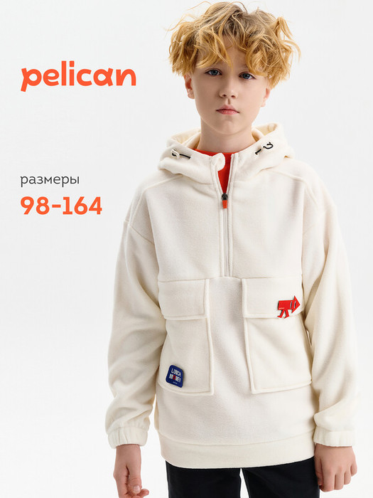 Толстовка флисовая для мальчика со спущенным плеччом из 100% полиэстера. Для удобства надевания в верхней части переда застежка на молнию. По переду большие накладные карманы с клапанами. На спинке кокетка из флиса, переходящая на перед. Низ рукава присборен на внутренний эластик. По низу изделия притачной пояс. Капюшон двухшовный со стойкой по переду и люверсами, высота капюшона регулируется с помощью эластик -корд. Внутренняя обтачка капюшона выполнена из флиса. Перевод текста на капюшоне: чтобы согреться. Перевод текста на кармане: деньги на обед.