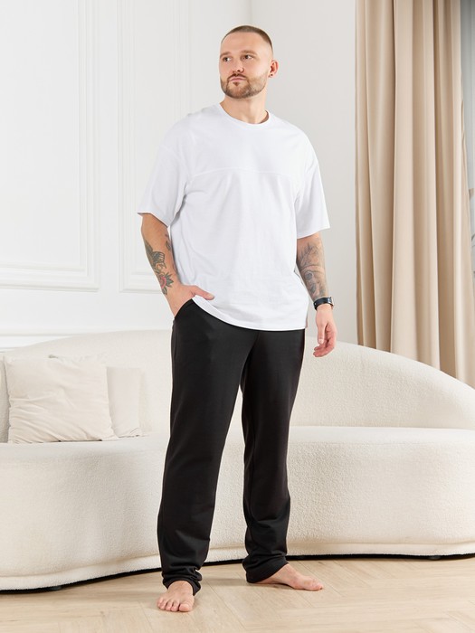 Брюки мужские из гладкокрашенго трикотажного полотна "футер 2-нитка", свободного покроя, на притачном поясе с эластичной тесьмой внутри, с карманами в боковых швах. Нижние срезы обработаны подгибкой.