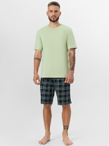 Костюм мужской, состоящий из футболки и брюк. Футболка однотонная с принтом на груди; модель свободная, со спущенной линией плеч, овальным вырезом горловины. Брюки из полотна с набивным рисунком эксклюзивного дизайна, прямые, с боковыми карманами с обтачными входами, на притачном поясе с отстроченной эластичной тесьмой.