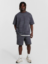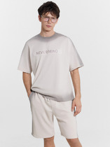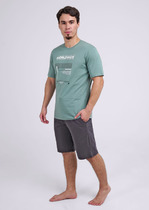 Костюм мужской, состоящий из футболки и брюк. Футболка однотонная с принтом на груди; модель свободная, со спущенной линией плеч. Брюки из полотна с набивным рисунком в узкую черно-белую полоску, прямые, с боковыми карманами с обтачными входами, на притачном поясе с отстроченной эластичной тесьмой.