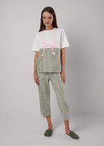 Пижама из мягкого модала с меланжевой фактурой, дополненная романтичной атласной отделкой и кружевом. Брюки длины 7/8 с комфортным поясом на плотной резинке. Передняя часть брюк оформлена атласной каймой.