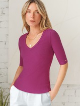 Горловина округлой формы обработана обтачкой из рибаны. Рукава втачные короткие.