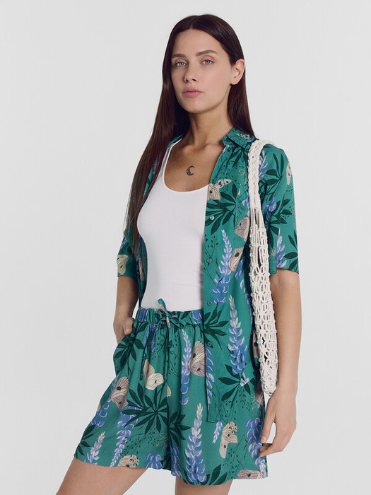 Шорты женские свободного силуэта из ткани. На детали переда карманы с отрезным бочком.