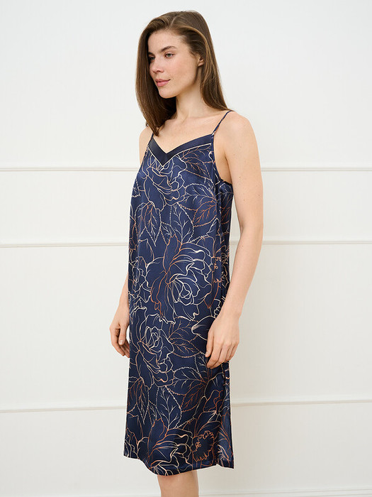Женская  сорочка с цветочным принтом и V-образным вырезом с контрастным кантом. Модель на тонких регулируемых бретелях, длиной ниже колена с разрезом от середины бедра.
