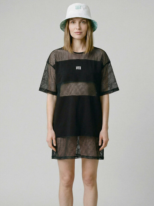 Пляжное женское оверсайз платье. Модель с длиной мини, выполнена из комбинации хлопкового трикотажа джерси и сетки. На груди размещён небольшой логотип в виде жаккардовой нашивки. Можно составить family look c детским вариантом аналогичного дизайна.