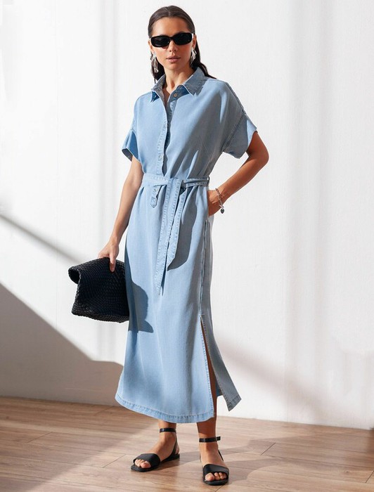 Джинсовое длинное платье-рубашка плотностью 7,8 OZ светло-голубого цвета с поясом и разрезами  — универсальное решение для современного гардероба. Модель легко вписывается как в повседневный, так и в деловой стиль. Пояс отлично подчеркивает талию, а цельнокроеный рукав добавляет комфорта. Высокие разрезы по бокам обеспечивают свободу движений, добавляют динамики образу и стиля. Особенность этого платья  - состав ткани, сочетающая прочность и мягкость лиоцелла с вискозой, что делает её невероятно комфортной, дышащей,, устойчивой к сминанию и идеально подходящей для чувствительной кожи. Благодаря нежным тактильтным ощущениям, будто шелк, от которого ощущается приятная прохлада, легкое платье подойдет на теплое время года и даже на жаркое лето. Повседневное платье с коротким рукавом подходит на большие размеры и способно подчеркнуть красоту любой фигуры. Продуманный свободный крой платья с отложным воротничком отлично садится на разные типы телосложения, создавая аккуратный и современный образ. Классический силу