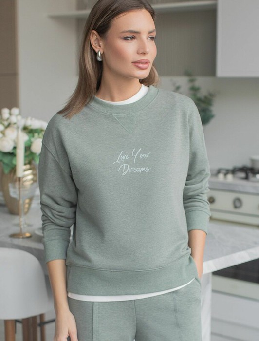 09.04 Vilatte Джемпер из петельчатого футера двухнитки с эластаном D49.140 олив