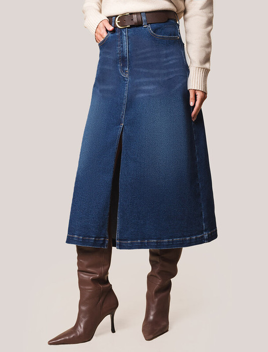 Совместные покупки Нижний Тагил Женская одежда Юбки — 09.04 Vilatte Джинсовая юбка из плотной эластичной джинсы 13.8OZ. D56.122 синий