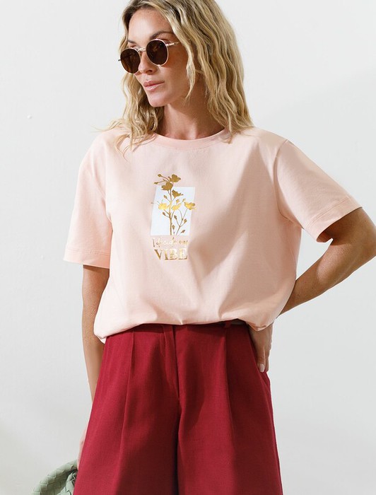 Модная футболка пудрового цвета привлекает внимание своим интересным дизайном и ярким принтом. Благодаря прямому крою изделие комфортно садится на любую фигуру, в том числе на большие размеры, и не сковывает движений. Круглый вырез подчеркивает современный стиль, а натуральный материал плотностью 170 Г/м2 из хлопка с добавлением эластана обеспечивает удобство в повседневной носке и приятные тактильные ощущения. Прочность и износостойкая структура позволяют сохранять свежий внешний вид после множества стирок. Принт в виде цветов и надписи нанесен красками с устойчивым покрытием, перевод надписи: I decide my vibe - Я определяю свое настроение.Стильная футболка гармонично вписывается в любой гардероб и подойдет для прогулок, отдыха или неформальных встреч. Благодаря особенностям кроя модель хорошо сидит, скрывая недостатки и подчеркивая достоинства. Яркая футболка идеально сочетается с базовыми вещами, позволяя создавать новые интересные образы каждый день.