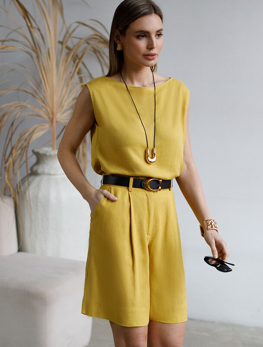 Шорты-бермуды выполнены изо льна с вискозой. Свободная модель с посадкой на талии. Ткань изящно струится, почти не мнется и сохраняет форму в течении долгого времени, обладает высокой воздухопроницаемостью. Идеальное решение в жаркий период. Подходит для любой фигуры и скрывает недостатки. Сочетается в костюме с топом D23.060 и блузками D29.237, D29.244
