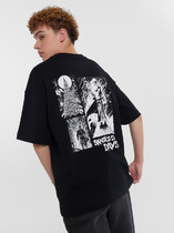 Футболка свободного кроя выполнена из премиального хлопка. Авторский принт нанесен красками с устойчивым покрытием. Благодаря эластану, носить изделие очень комфортно, и оно сохранит свой безупречный вид в течение долгого времени. На рукаве нашивка из эко-кожи с логотипом бренда.