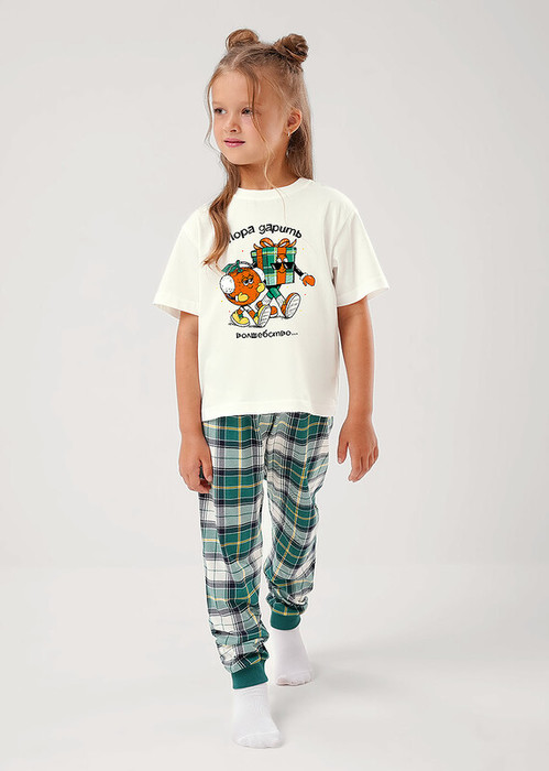 Новогодняя хлопковая пижама из футболки и брюк. Горловина , манжеты по низу брюк из эластичного полотна. Футболка свободного кроя, тематический принт по переду. Брюки среднего объема, эластичный пояс обеспечит комфорт и идеальную посадку.