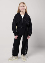 Брюки для девочки из мягкого петельчатого трикотажа. Эластичный пояс на резинке регулируется по ширине с помощью шнурка. Внизу эластичные манжеты.