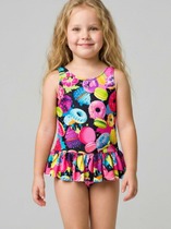 Слитный купальник на лямках для девочки. Украшен оборками. Оригинальная набивка выполнена из стойких гипоаллергенных красителей.