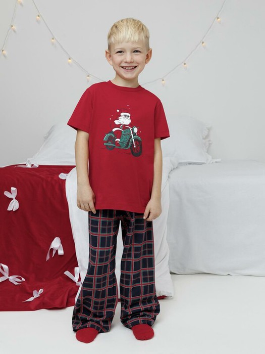 Новогодняя пижама из натурального хлопка для мальчика. Футболка с короткими втачными рукавами и прямые брюки с эластичной резинкой в поясе. Пижама отлично подойдёт для создания уютных домашних образов или в качестве подарка на Новый год и Рождество. Оригинальная набивка и принт выполнены из стойких текстильных гипоаллергенных красителей. Изделие сохраняет цвет и форму после многократных стирок. Все трикотажные полотна производятся в соответствии с нормами швейцарского сертификата ЭкоТекс.