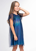 Нарядное платье для девочки из высококачественного трикотажа супрем с лёгким слоем из сетки с золотыми блёстками. Длинные рукава из сетки собраны на резинку. Для удобства одевания платье застёгивается на пуговицу на спинке. Платье сохраняет форму и стойкий цвет после многочисленных стирок и идеально подходит для праздников и фотосессий.