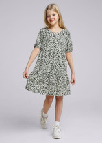 Платье для девочек свободного силуэта с отрезной юбкой.  Горловина округлой формы обработана обтачкой  из рибаны. Рукава втачные, корткие. Юбка трехслойная на сборке. Верхние два слоя из полотна трикотажного сетки, подкладка из полотна трикотажного кулирного.