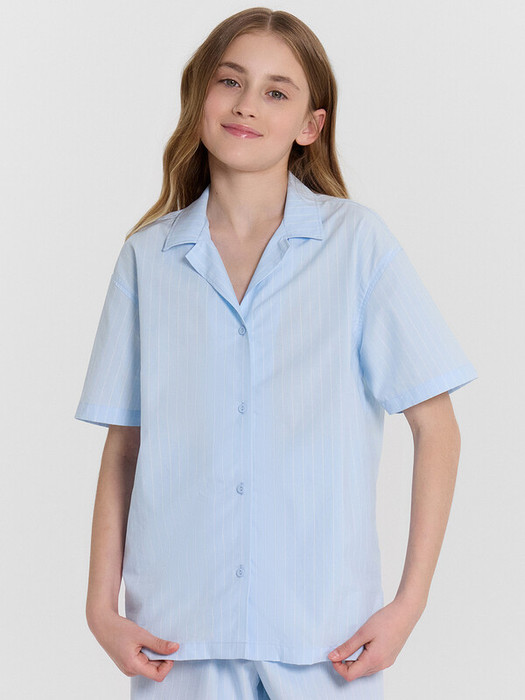 Блузка для девочек. свободного силуэта из ткани.  По переду обработана застежка на пуговицы d=10mm и петли. Рукава короткие, втачные, слегка спущены. Нижние срезы изделия и рукавов обработаны швом в подгибку.