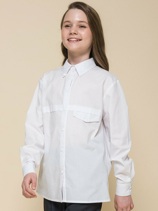 Школьная блузка прямого силуэта для девочки. Преобладающий в составе ткани хлопок делает эту модель мягкой, дышащей и комфортной для ребёнка. Благодаря полиэстеру изделие сохраняет форму и превосходный внешний вид. На спинке кокетка с защипом - свобода движения, комфорт в течение дня.  По переду под кокеткой имитация кармана в виде декоративного клапана – актуально и стильно. Воротник украшают декоративные пуговицы — оригинально. Практичная и универсальная модель благодаря лаконичному дизайну великолепно сочетается с различными брюками и юбками. Отличный вариант детской блузки для школы.