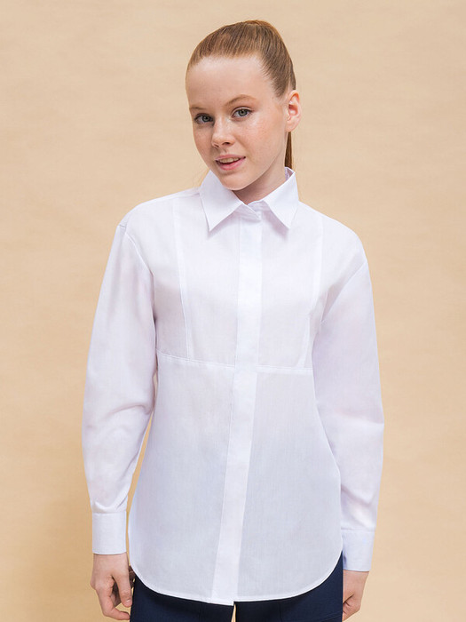 Блузка детская свободного кроя для девочки. Школьная блузка с классическим отложным воротничком великолепно подходит девочкам с разными типами фигуры. Удобная потайная центральная застёжка на петли-пуговицы — классический вариант. По переду лаконичный декор в виде наклонных рельефов, идущих по подреза. Фигрная линия низа, в боковые