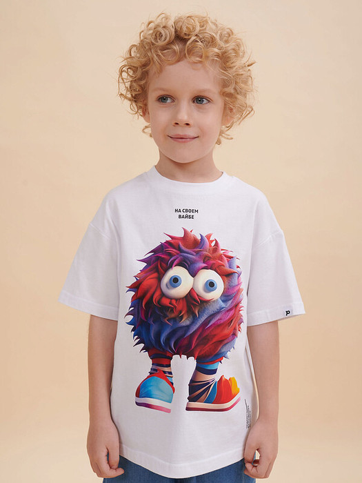 Детская футболка оверсайз. Комфортный джемпер свободного силуэта со спущенным плечом не будет стеснять движений ребёнка. Объёмная майка подарит ощущение комфорта и уюта. Вырез горловины отделан эластичной рибаной (ткань в рубчик) — она прекрасно держит форму, при этом ребёнку удобно надевать и снимать футболку. Модель неприхотлива в уходе. Главная фишка футболки — яркий стильный принт, изображающий персонажа, сгенерированного нейросетью (искусственным интеллектом). Это супермодный тренд!  Футболка с прикольным принтом по переду выполнена из 100% высококачественного хлопка — изделие мягкое и воздухопроницаемое, что позволяет коже ребёнка свободно дышать. Принт эластичный и стойкий — без проблем переносит многочисленные стирки, не теряя своей яркости. На принте изображён смешной яркий пушистый чудик в полосатых носках + надписи "на своём вайбе" и "создано с помощью искусственного интеллекта". Футболка оверсайз белая универсальна, подходит и для девочек, и для мальчиков. Как для малышей дошкольного и младшего школьного возраста, так и для подростков. Модель идеальна для детского сада, спорта, прогулок, отдыха, а также в качестве домашней одежды. В линейке представлены следующие размеры: 1 (86); 2 (92); 3 (98); 4 (104); 5 (110); 6 (116); 7 (122); 8 (128); 9 (134); 10 (140); 11 (146). Белые футболки подходят для носки летом, осенью и весной (демисезон), зимой в качестве среднего слоя одежды. Легко сочетается с различными брюками, джинсами, юбками, легинсами и шортами. Футболка с принтом оверсайз — стильный и красивый подарок сыну, дочери, внуку или внучке на любой праздник. Выбирайте нужный размер по таблице размеров на фото. Цвет товара на экране вашего устройства может отличаться от цвета изделия вживую.
