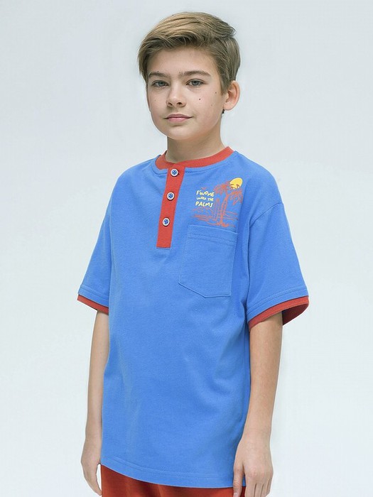 Футболка-хенли для мальчиков. 100% хлопок в составе – ткань мягкая, дышащая, приятная на ощупь. Свободный прямой силуэт, воротничок из рибаны – не давит, эластичный. Планка у горловины на пуговицах. Контрастная отделка горловины и рукавов дает имитацию двухслойности – оригинальная фишка модели. Накладной карман и яркий принт спереди для позитивного настроения. Подходит на каждый день, для активного образа жизни, идеальна для пляжного сезона.