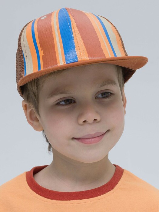 Кепка-снеп для мальчика круглой формы с прямым козырьком. Вставки по бокам и сбоку из сетки - оптимальное решение для весенне-летнего сезона. Оригинальной особенностью кепки является разноцветный принт на передней части. Размер кепки регулируется с помощью пластиковой застежки.